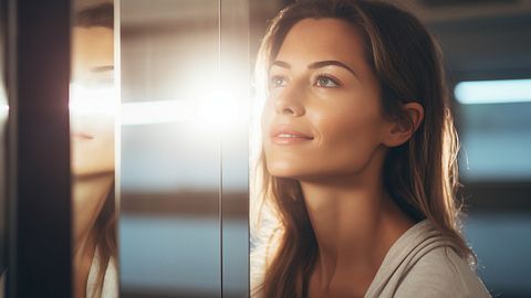 A woman in her late 30s looking into a mirror admiring her glowing skin.