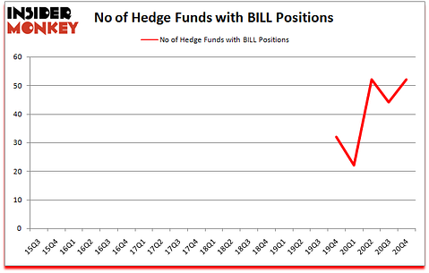 Bill.com Holdings, Inc. (NYSE:BILL) was in 52 hedge funds’ portfolios at the end of December. The all time high for this statistic is 52. This means the bullish number of hedge fund positions in this stock currently sits at its all time high. BILL investors should pay attention to an increase in hedge fund interest lately. There were 44 hedge funds in our database with BILL positions at the end of the third quarter. Our calculations also showed that BILL isn’t among the 30 most popular stocks among hedge funds (click for Q4 rankings).