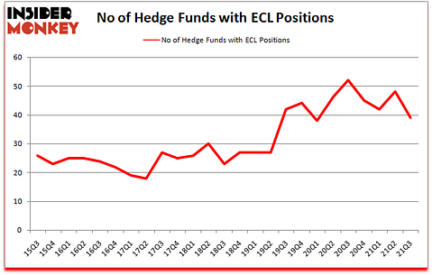 Ecolab Inc. (NYSE:ECL) has experienced a decrease in hedge fund sentiment lately. Ecolab Inc. (NYSE:ECL) was in 39 hedge funds’ portfolios at the end of the third quarter of 2021. The all time high for this statistic is 52. Our calculations also showed that ECL isn’t among the 30 most popular stocks among hedge funds (click for Q3 rankings).