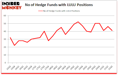 Lululemon Athletica inc. (NASDAQ:LULU) has experienced a decrease in hedge fund sentiment lately. Lululemon Athletica inc. (NASDAQ:LULU) was in 41 hedge funds’ portfolios at the end of September. The all time high for this statistic is 52. There were 46 hedge funds in our database with LULU positions at the end of the second quarter. Our calculations also showed that LULU isn’t among the 30 most popular stocks among hedge funds (click for Q3 rankings).