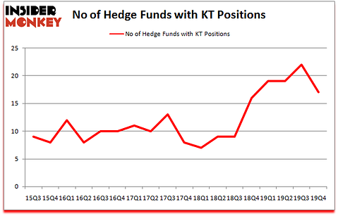 Is KT Corporation (NYSE:KT) a buy right now? The smart money is turning less bullish. The number of long hedge fund bets went down by 5 recently. Our calculations also showed that KT isn’t among the 30 most popular stocks among hedge funds (click for Q4 rankings and see the video at the end of this article for Q3 rankings).