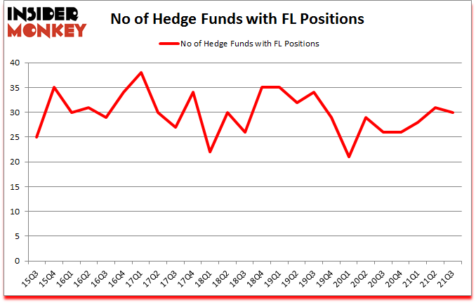 Heading into the fourth quarter of 2021, a total of 30 of the hedge funds tracked by Insider Monkey held long positions in this stock, a change of -3% from the previous quarter. The graph below displays the number of hedge funds with bullish position in FL over the last 25 quarters. With hedge funds’ capital changing hands, there exists a few notable hedge fund managers who were upping their stakes substantially (or already accumulated large positions).