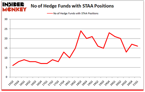 At first quarter’s end, a total of 16 of the hedge funds tracked by Insider Monkey were bullish on this stock, a change of -6% from the fourth quarter of 2020. The graph below displays the number of hedge funds with bullish position in STAA over the last 23 quarters. So, let’s find out which hedge funds were among the top holders of the stock and which hedge funds were making big moves.