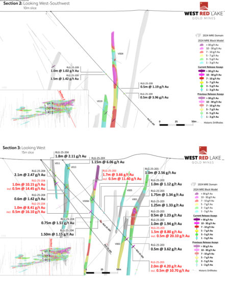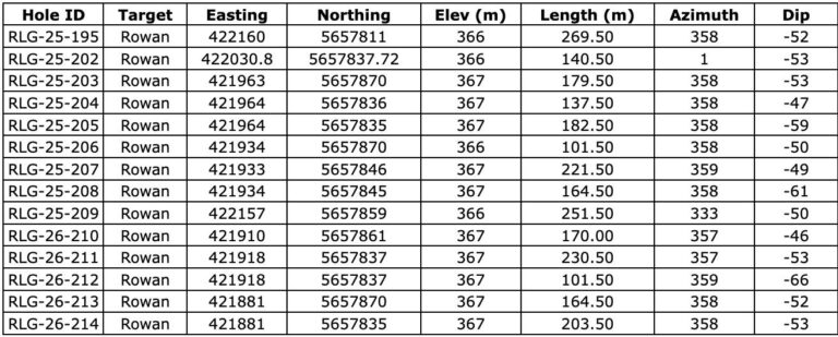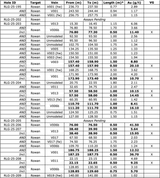 - Hole RLG-25-207 Intersected Vein 001 with 1.5m @ 12.32 g/t Au, from 186.75m to 188.25m; Including 0.5m @ 36.70 g/t Au, from 187.25m to 187.75m. This intercept was complimented by visible gold spatially associated with quartz veining and was along the western margin of the currently modeled V001 domain.