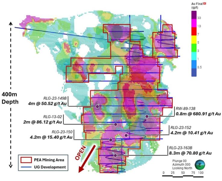 - Hole RLG-25-206 Intersected Vein 006 with 0.5m @ 41.50 g/t Au, from 76.0m to 76.5m. This intercept was complimented by visible gold spatially associated with quartz veining.