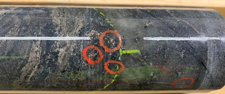 FIGURE 1. Multiple instances of visible gold in hole WRL-26-047 associated with quartz veining and pyrite + pyrrhotite. Drill core is NQ (47.6 mm) diameter.