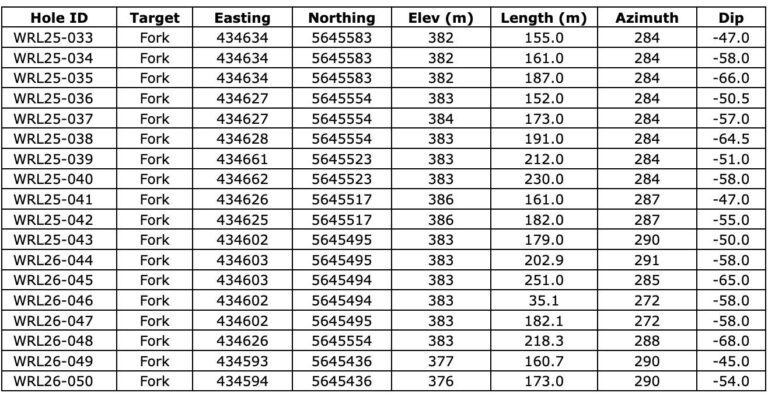 - Hole WRL25-037 Intersected 4.5m @ 5.8 g/t Au, from 145.65m to 150.15m; Including 1m @ 7.68 g/t Au, from 145.65m to 146.65m; Also including 2.5m @ 6.97 g/t Au, from 147.15m to 149.65m.