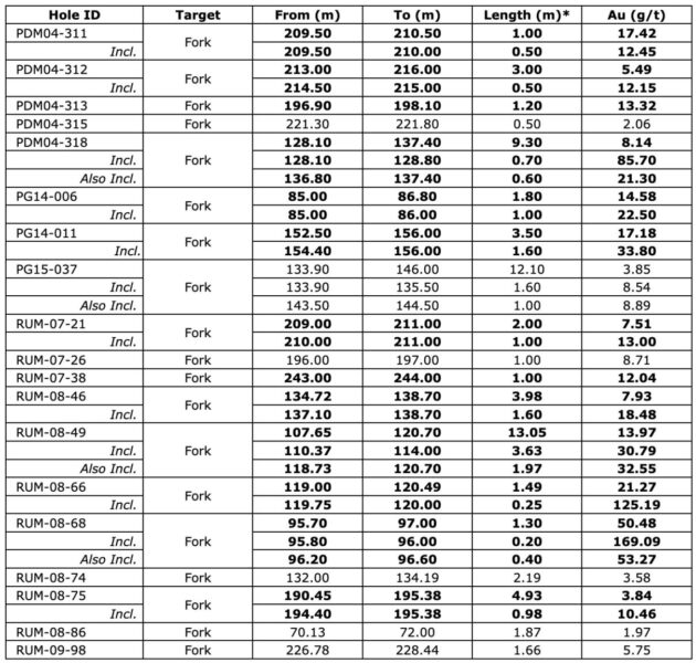 - Hole RUM-08-49 Intersected 13.05m @ 13.97 g/t Au, from 107.65m to 120.7m, Including 3.63m @ 30.79 g/t Au, from 110.37m to 114.00m, Also including 1.97m @ 32.55 g/t Au, from 118.73m to 120.70m.