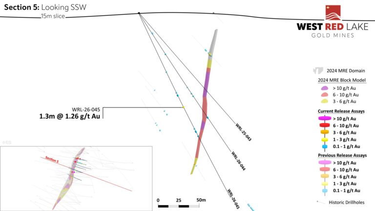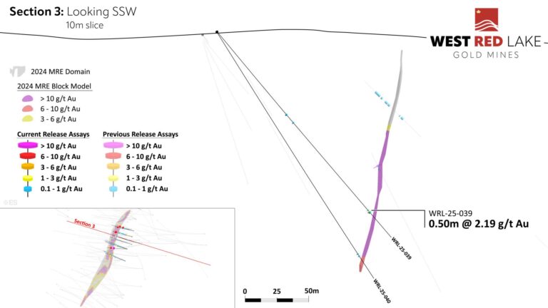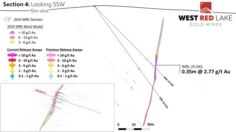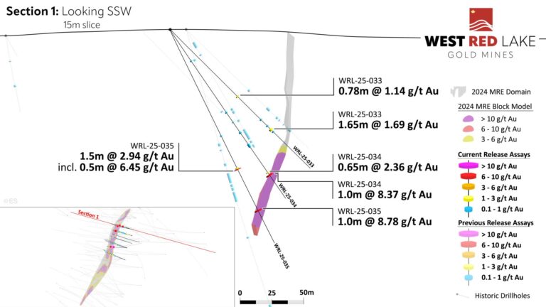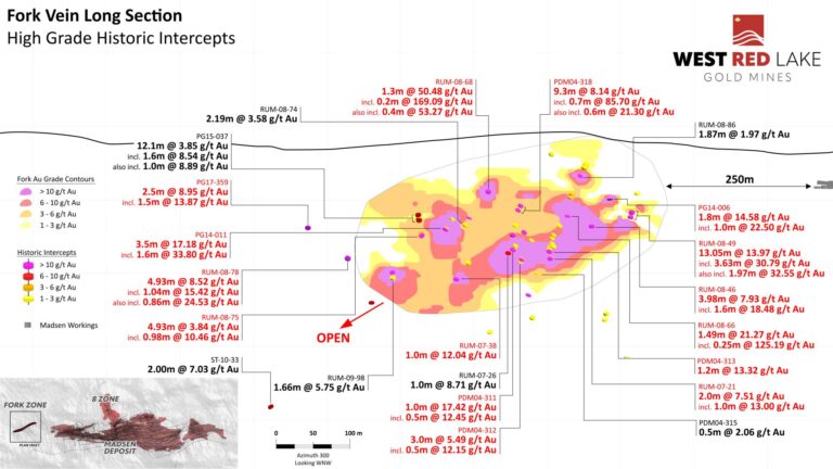 The Fork deposit currently contains an Indicated mineral resource of 20,900 ounces (“oz”) grading 5.3 grams per tonne (“g/t”) gold (“Au”) within 123,800 tonnes with an additional Inferred resource of 49,500 oz grading 5.2 g/t Au within 298,200 tonnes. West Red Lake Gold announced the interpretation of a high-grade core within this resource in December 2024 (news release available here).