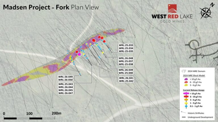 West Red Lake Gold Mines Ltd.(“West Red Lake Gold” or “WRLG” or the “Company”) (TSXV:WRLG)(OTCQB: WRLGF) is pleased to announce results from the infill drilling program at its 100% owned Fork Deposit located approximately 250 metres (“m”) southwest from its Madsen Mine in the Red Lake Gold District of Northwestern Ontario, Canada.