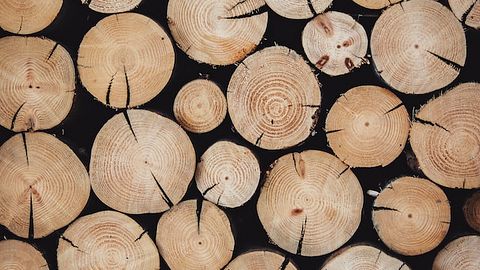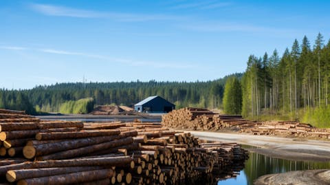 A lumber mill with pristine forests in the background, showing the company’s commitment to renewable energy.