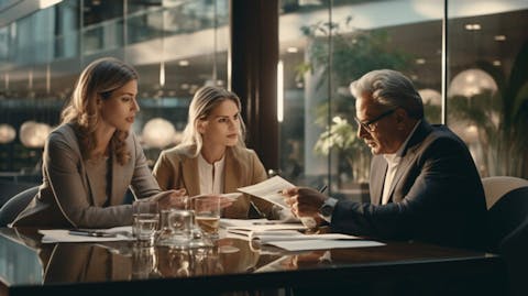 A shot of a financial advisor meeting with a wealthy couple discussing their portfolio.