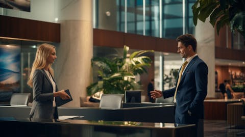 A busy banker talking to a satisfied customer in a sleek lobby.