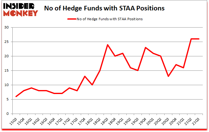 At the end of the third quarter, a total of 26 of the hedge funds tracked by Insider Monkey held long positions in this stock, a change of 0% from the previous quarter. By comparison, 13 hedge funds held shares or bullish call options in STAA a year ago. So, let’s examine which hedge funds were among the top holders of the stock and which hedge funds were making big moves.