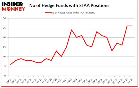 At the end of the third quarter, a total of 26 of the hedge funds tracked by Insider Monkey held long positions in this stock, a change of 0% from the previous quarter. By comparison, 13 hedge funds held shares or bullish call options in STAA a year ago. So, let’s examine which hedge funds were among the top holders of the stock and which hedge funds were making big moves.