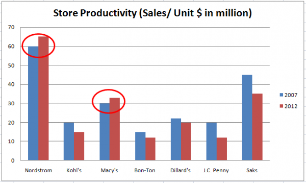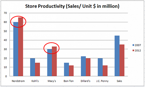 The following chart shows that only Nordstrom and Macy’s had higher productivity in 2012 as compared to 2007 on a unit basis.