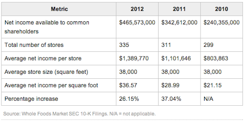 The expansion peaked in 2007, when the average size of new stores opened was 56,500 square feet. More recently, new store size on average is on the decline, which has helped the company maintain an average aggregate size of 38,000 square feet for the last three years. According to the Food Marketing Institute, the median U.S. grocery retail store size is 46,000 feet. The last time the national average saw 38,000 feet was 1996. Why is Whole Foods so bent on controlling store size? Essentially, the company has recognized that it can obtain better results by optimizing sales per square foot, rather than just expanding average store size to sell more. The results of the last three years are worth noting: