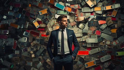 A businessman in a suit holding a credit card, standing in front of a wall of electronics.