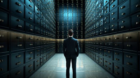 A friendly bank-teller standing behind rows of deposit boxes, representing the reliable banking products.