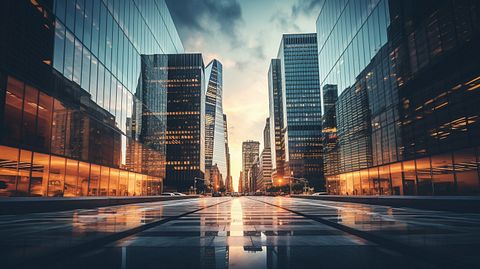 An image of a busy financial district skyline with the company’s building standing out.