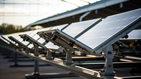 A photovoltaic field at dawn, its solar panels shimmering in the light of a new day.