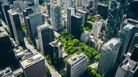 An aerial view of multiple modern high-rise commercial buildings, representing the company’s wide-ranging real estate portfolio.