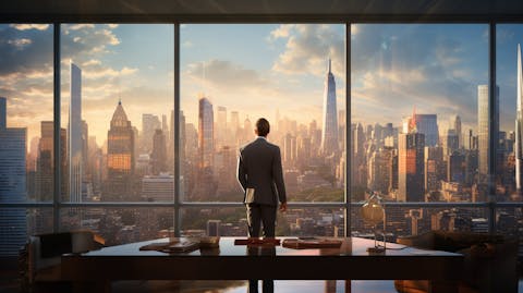 An executive in a modern open office overlooking the skyline of a bustling city.