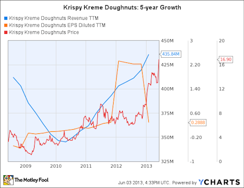To make matters worse, a massive accounting scandal in 2005 tarnished the company’s credibility, and investors fled. The subsequent financial crisis swept away what growth was left in Krispy Kreme Doughnuts (NYSE:KKD), and the stock fell to nearly $1 per share in March 2009. The bears proclaimed that its then privately held rival, Dunkin Brands Group Inc (NASDAQ:DNKN), had won, and that Krispy Kreme was doomed to slowly fade into obscurity.