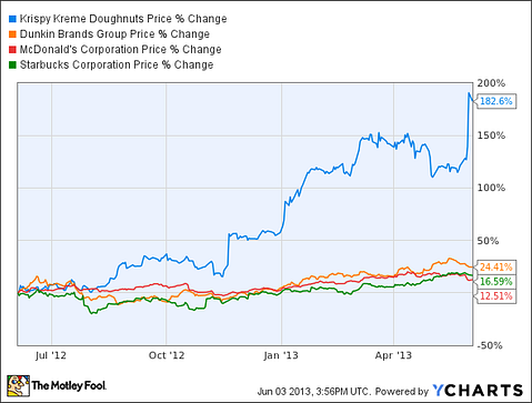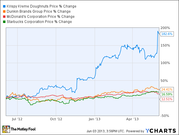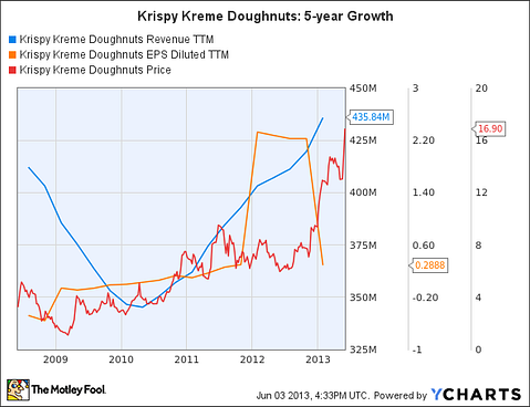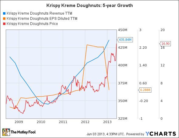 To make matters worse, a massive accounting scandal in 2005 tarnished the company’s credibility, and investors fled. The subsequent financial crisis swept away what growth was left in Krispy Kreme Doughnuts (NYSE:KKD), and the stock fell to nearly $1 per share in March 2009. The bears proclaimed that its then privately held rival, Dunkin Brands Group Inc (NASDAQ:DNKN), had won, and that Krispy Kreme was doomed to slowly fade into obscurity.