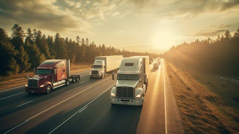 A fleet of trucks speeding along an interstate highway delivering goods to distant customers.
